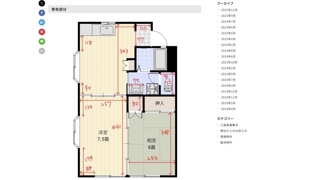 寸法は物件を借りるかどうかを検討している顧客にとって必要な情報というより、借りる契約をしたが、家具を配置するのに知りたい情報です。契約後、引き渡し前に、採寸のためにもう一度部屋を見たいというリクエストが結構ありますが、不動産会社も含めてみんなで立ち会ってとなると大変なので、予め測って載せておきます。